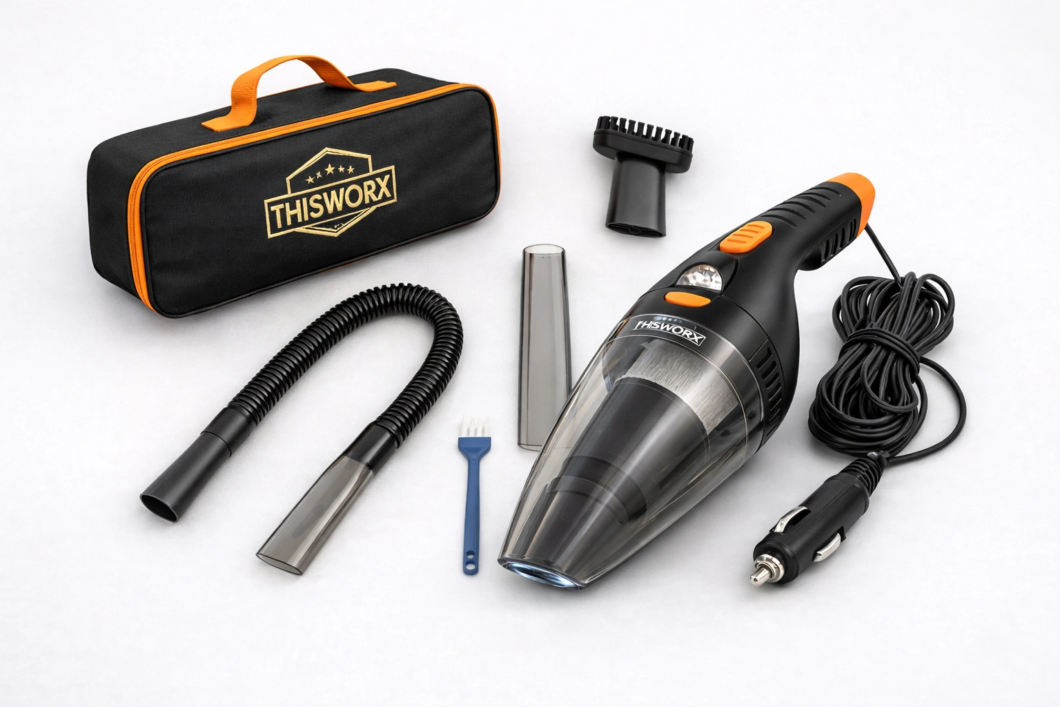ThisWorx Car Vacuum Cleaner 2.0 attachments, including a nozzle, extension tool, and brush attachment